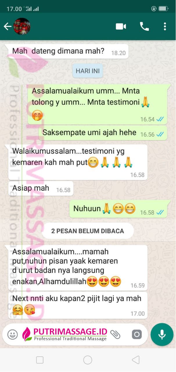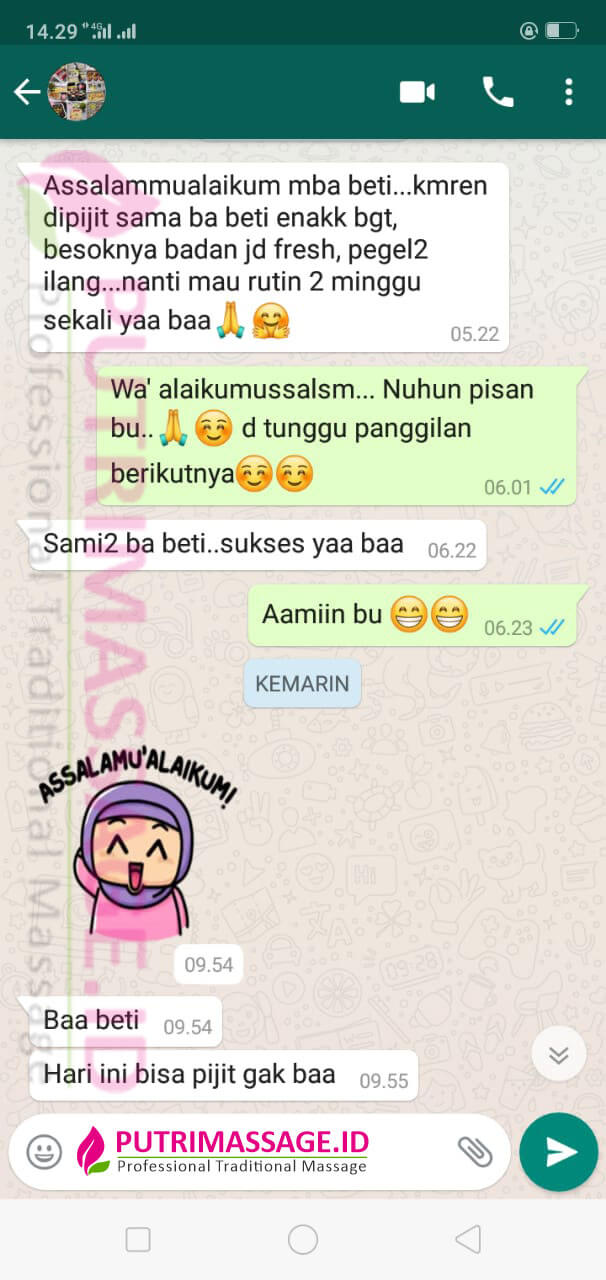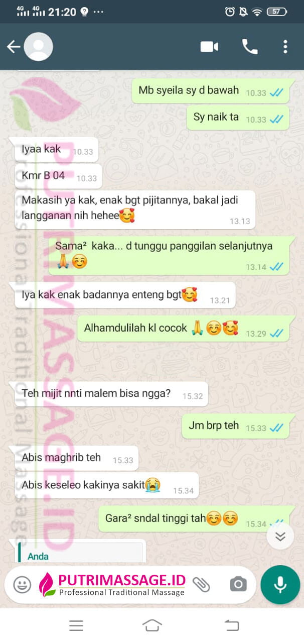 Untuk informasi harga pijat panggilan seperti: pijat tradisional, pijat lulur, pijat kerok, pijat shiatsu dan terapi telinga silahkan klik salah satu pada Layanan PutriMassage.id