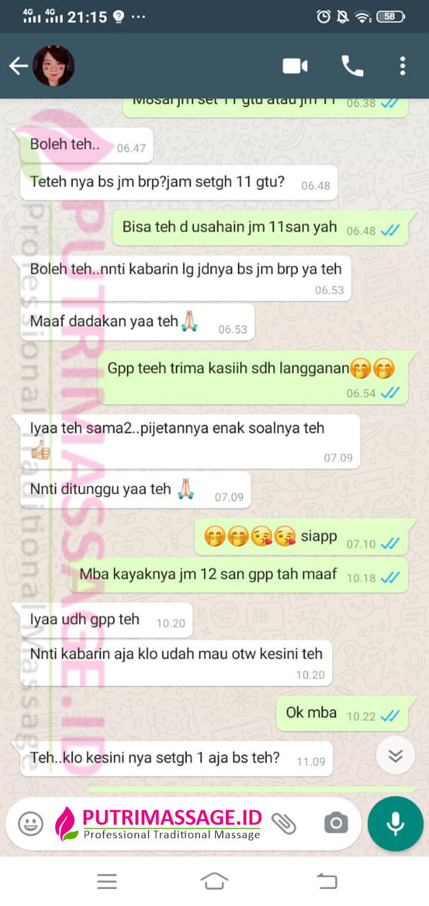 Terapis panggilan Putri Massage adalah wanita dan khusus untuk pijat wanita. Massage panggilan untuk pria saat ini kami belum melayani.